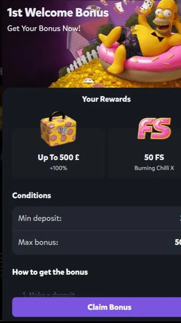 Первый Приветственный Бонус: Получите до 500£ +100% на депозит + 50 FS на Burning Chilli X. Мин. депозит всего 25£ — идеальный старт для новичков, чтобы нырнуть в бассейн золота с Гомером!