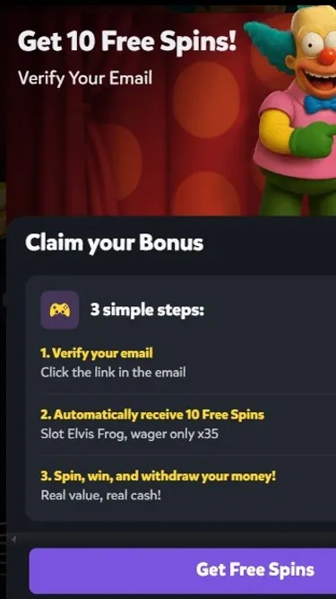 10 Бесплатных Спинов за Верификацию Email: Просто подтвердите email, и получите 10 FS на слоте Elvis Frog! Автоматически, без хлопот — спиньте, выигрывайте и выводите реальные деньги с вейджером x35. Легко, как 1-2-3!