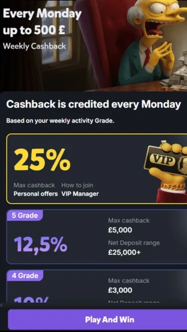 Еженедельный Кэшбэк до 500£: Каждое понедельник возвращаем до 25% от ваших ставок, в зависимости от вашего VIP-уровня. От 10% для 4-го грейда (макс. 3000£) до 25% для 5-го (макс. 5000£) — плюс персональные офферы и VIP-менеджер для настоящих хайроллеров!