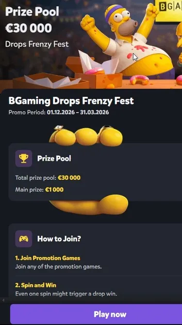 Drops Frenzy Fest от BGaming: Участвуйте в фестивале дропов с призовым пулом 30 000€ (с 01.12.2026 по 31.03.2026)! Главный приз 1000€, плюс случайные дропы за каждый спин в промо-играх. Присоединяйтесь, крутите и ловите удачу!